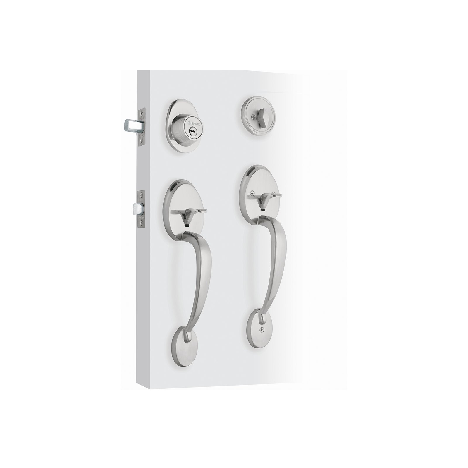 Doble jaladera y perilla, Lugo mariposa, acabado cromo mate, diseño funcional para puertas, Hermex clave 43028