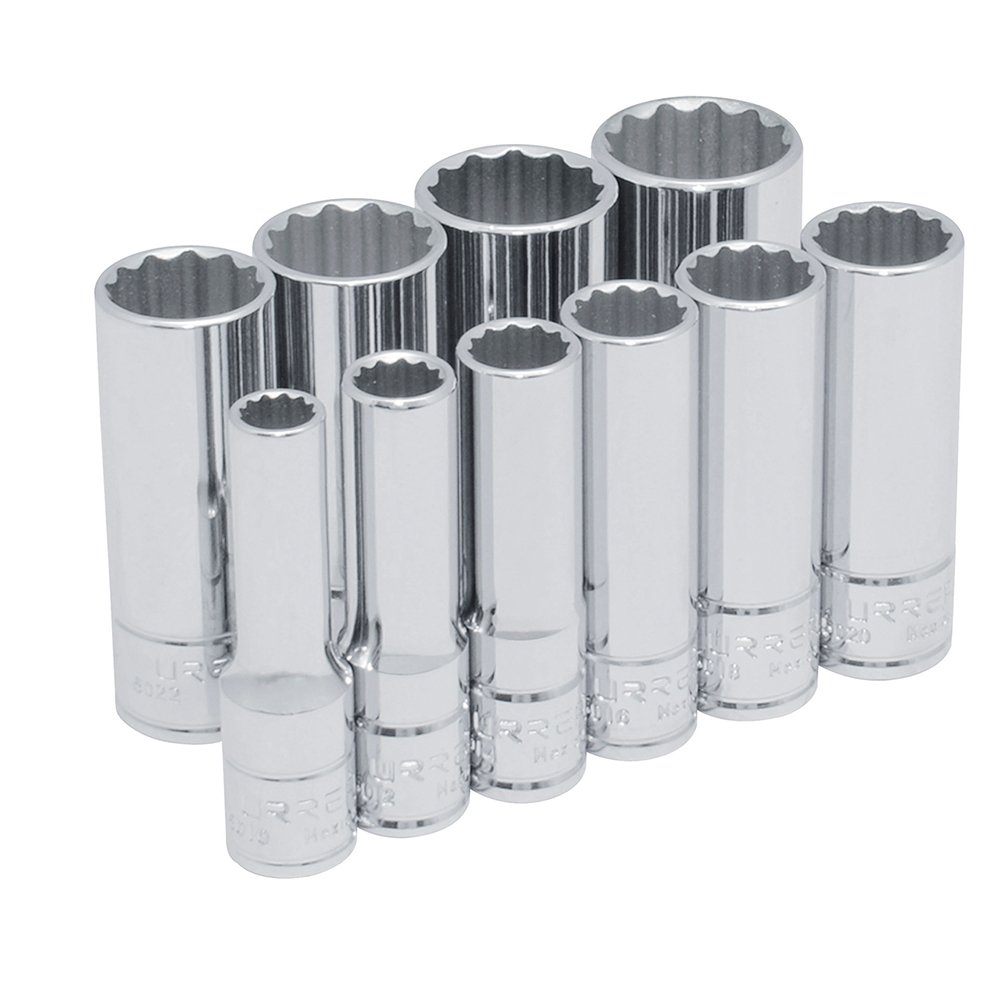 Juego de dados largos cuadro de 3/8″, 12 puntas en pulgadas en riel, 10 piezas Urrea 52107