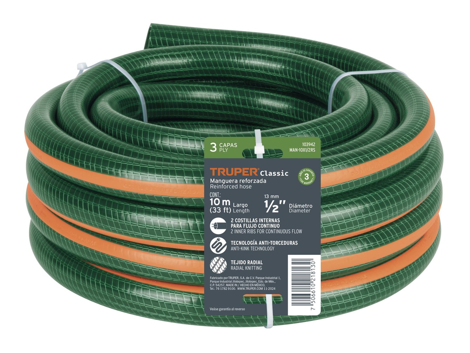 Manguera Truper Profesional de Jardín 1″ – Tecnología de 3 Capas 10 m sin Conexiones para Sistemas de Riego que Maximiza el Flujo de Agua en Áreas Extensas (Clave 103952)